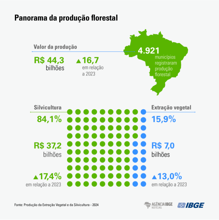 A produção florestal brasileira alcançou em 2024 o maior valor da série histórica, somando R$ 44,3 bilhões, um avanço de 16,7% em relação ao ano