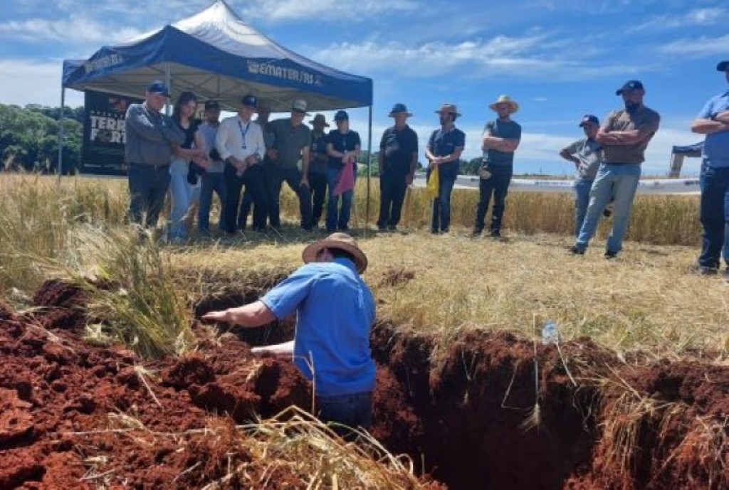Diagnóstico do perfil de solo: conduzido pelos extensionistas Oberdan Scolari e Anderson Ogliari, apresentou as características físicas do solo por meio da abertura de trincheiras, destacando a importância do manejo adequado para o desenvolvimento das plantas.
