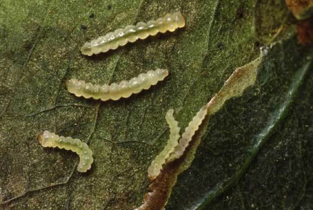 - “O inseto se instala nas folhas com comportamento ‘minador’: as fêmeas depositam ovos sobre a superfície foliar, as larvas eclodem e entram no mesofilo para se alimentar, causando injúrias e reduzindo a capacidade fotossintética das plantas”, explica.